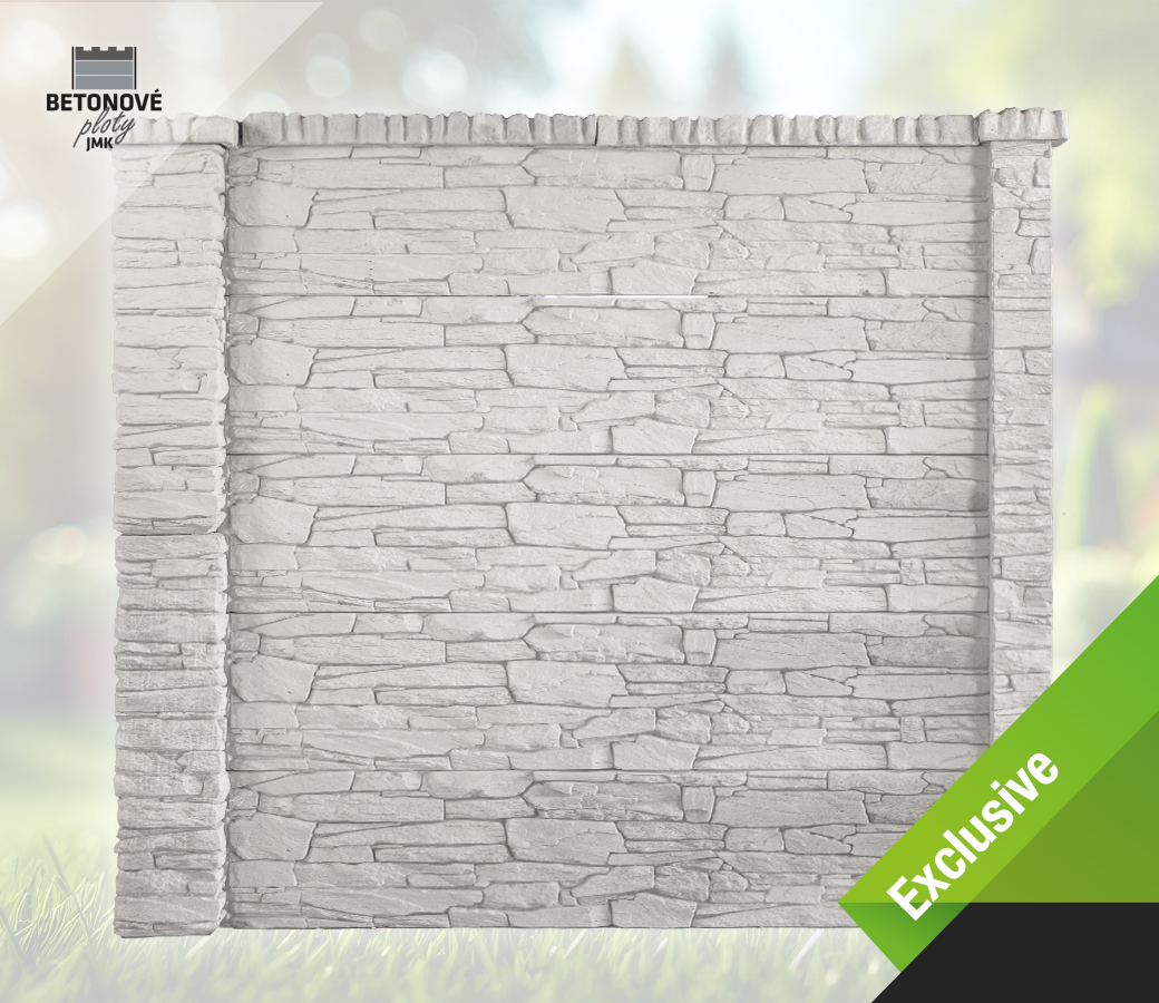 Betonový plot Exclusive s dekorem lámaného kamene působí majestátně a přirozeně zároveň. Ostré kontury a výrazná kresba imitace kamene vytvářejí autentický a luxusní vzhled. Tento dekor je ideální pro zákazníky, kteří chtějí, aby jejich oplocení nejen chránilo, ale i reprezentovalo a podtrhlo architekturu domu. Plot je dostupný v jednostranné i plnohodnotně oboustranné variantě, což jej předurčuje pro viditelné i frekventované lokality.